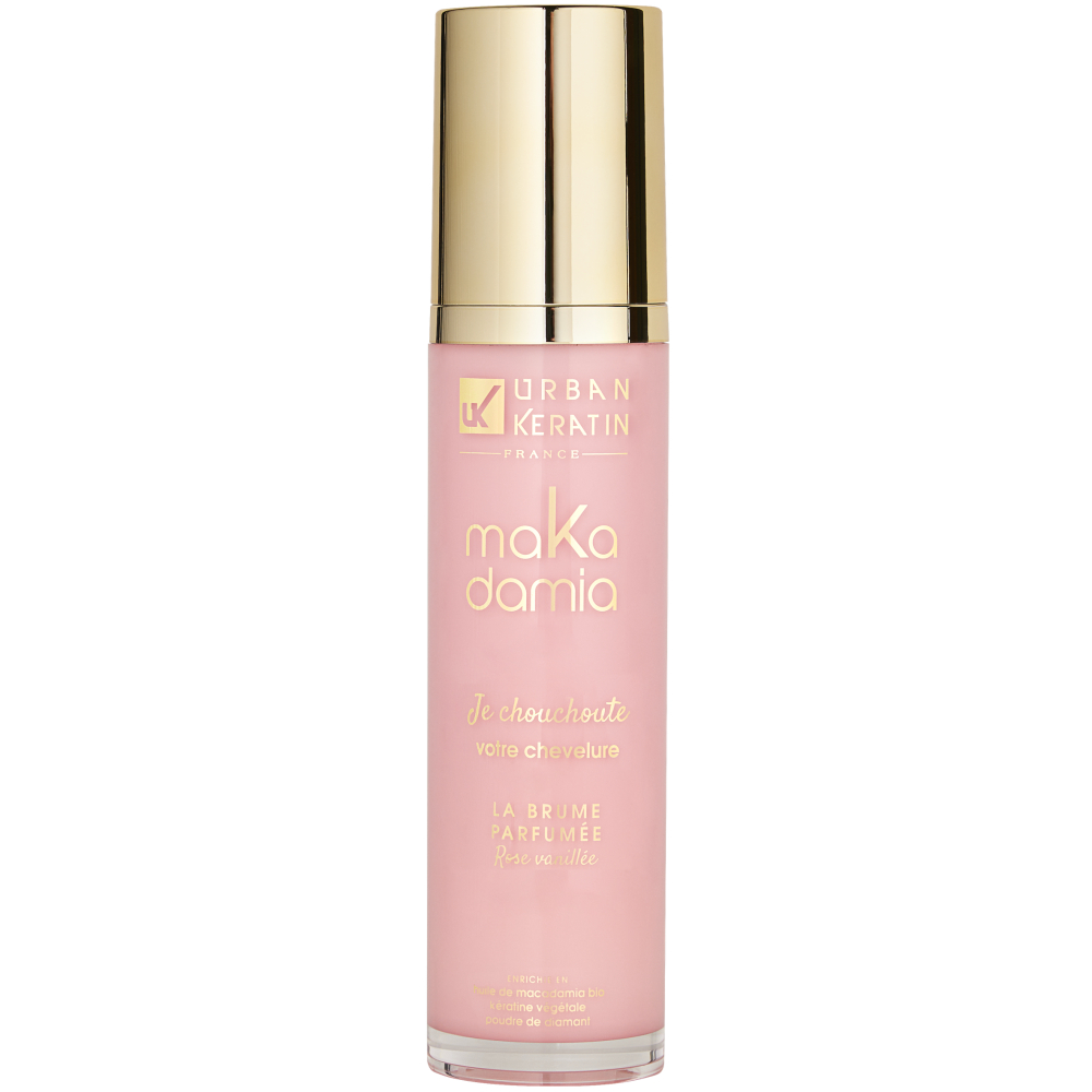 La Brume Parfumée Rose Vanillée Urban Kératin Makadamia est une brume hydratante légère enrichie en Huile de Noix de Macadamia, poudre de Diamant et kératine végétale.